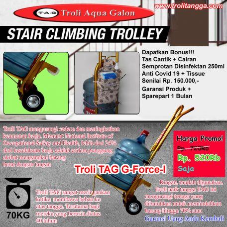 Troli TAG G-Force-I bisa memanjat tangga dengan mudah sehingga berat air galon 19kg berkurang menjadi 6kg atau jaminan uang anda kembali. Tinggi troli total : 110 cm, Dimensi dudukan troli : 45 cm x 37 cm, memudahkan dalam memindahkan barang terutama saat naik/turun tangga. Troli lipat TAG adalah troli serbaguna yang dapat dilipat dan dapat digunakan untuk mengangkut beban hingga 70 kg. Troli TAG ini bisa digunakan untuk mengangkut galon air aqua, tabung gas lpg, tabung kosigen, kardus mie, tas, tas sekolah dll
